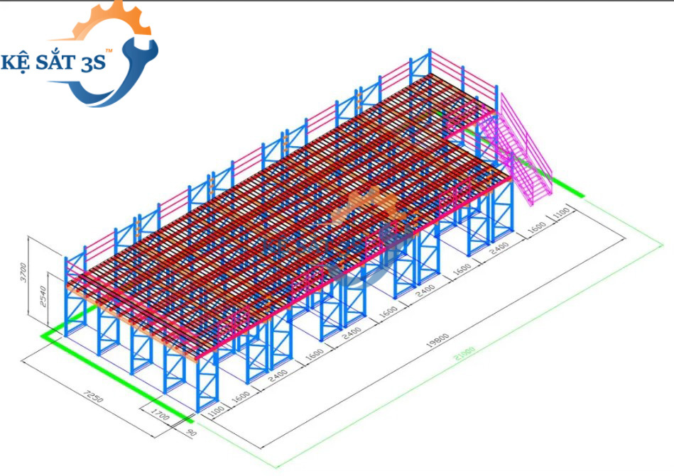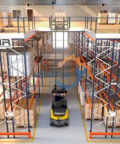 Kệ selective bên dưới để pallet và các lối đi cho xe nâng từ 3-4m được tận dụng câu dầm bên trên đỉnh cột và làm thành sàn gác lửng bên dưới.