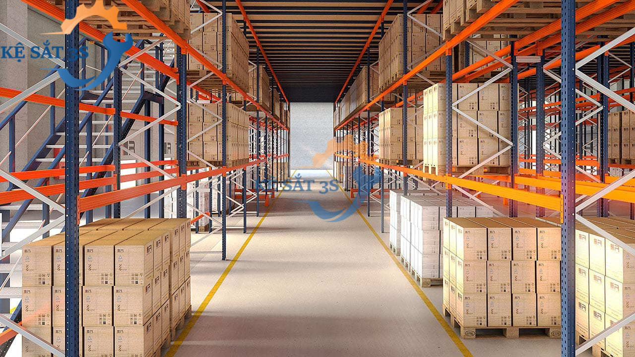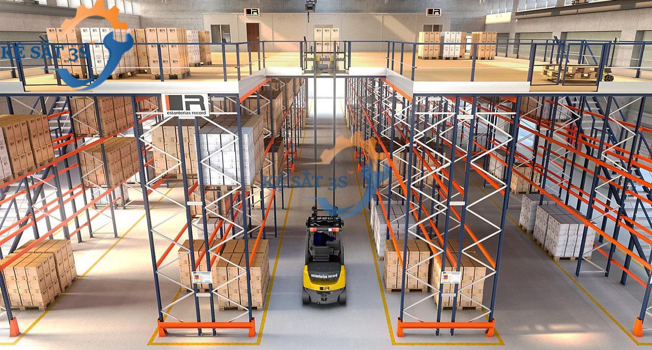 Kệ selective bên dưới để pallet và các lối đi cho xe nâng từ 3-4m được tận dụng câu dầm bên trên đỉnh cột và làm thành sàn gác lửng bên dưới.
